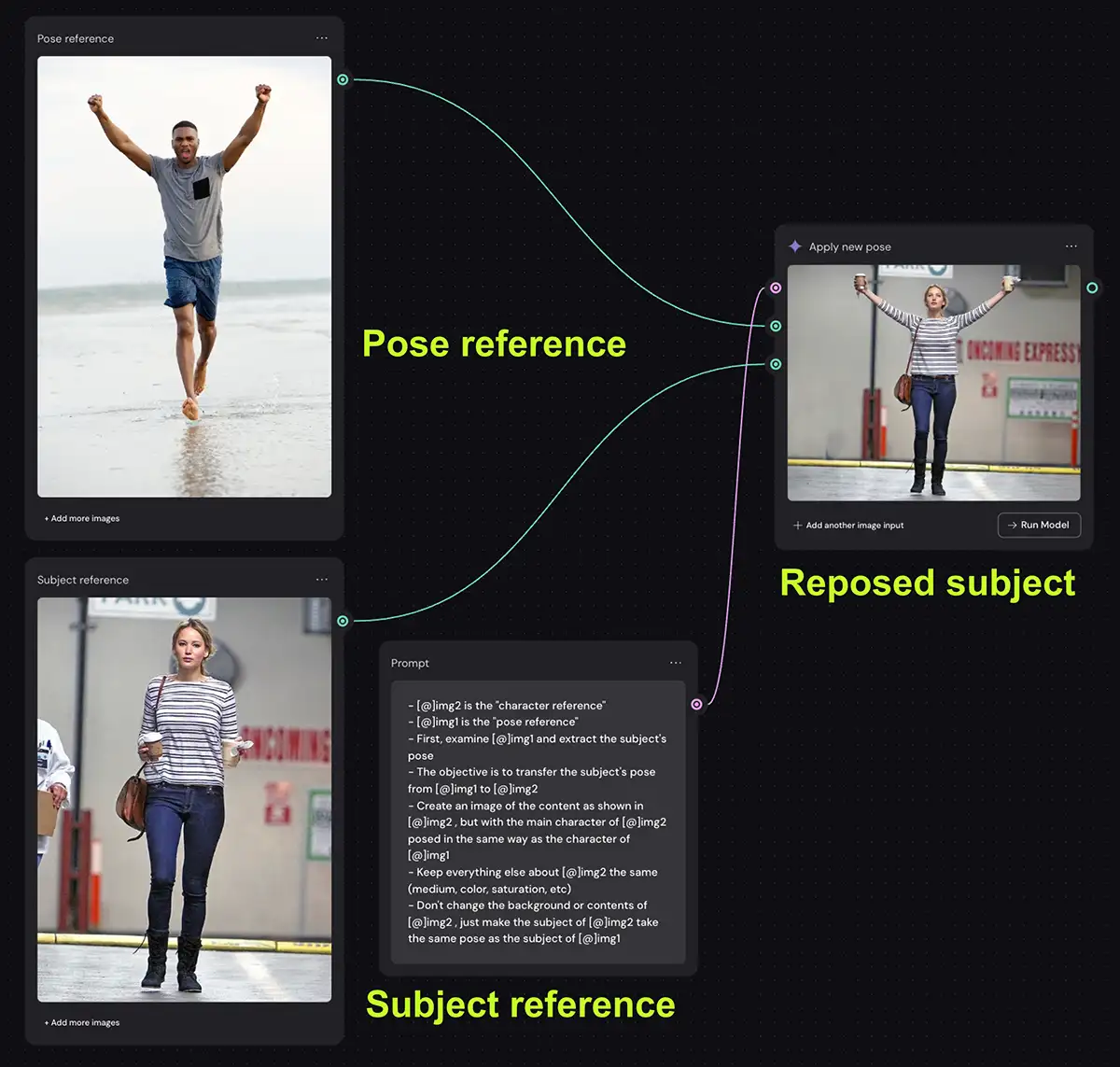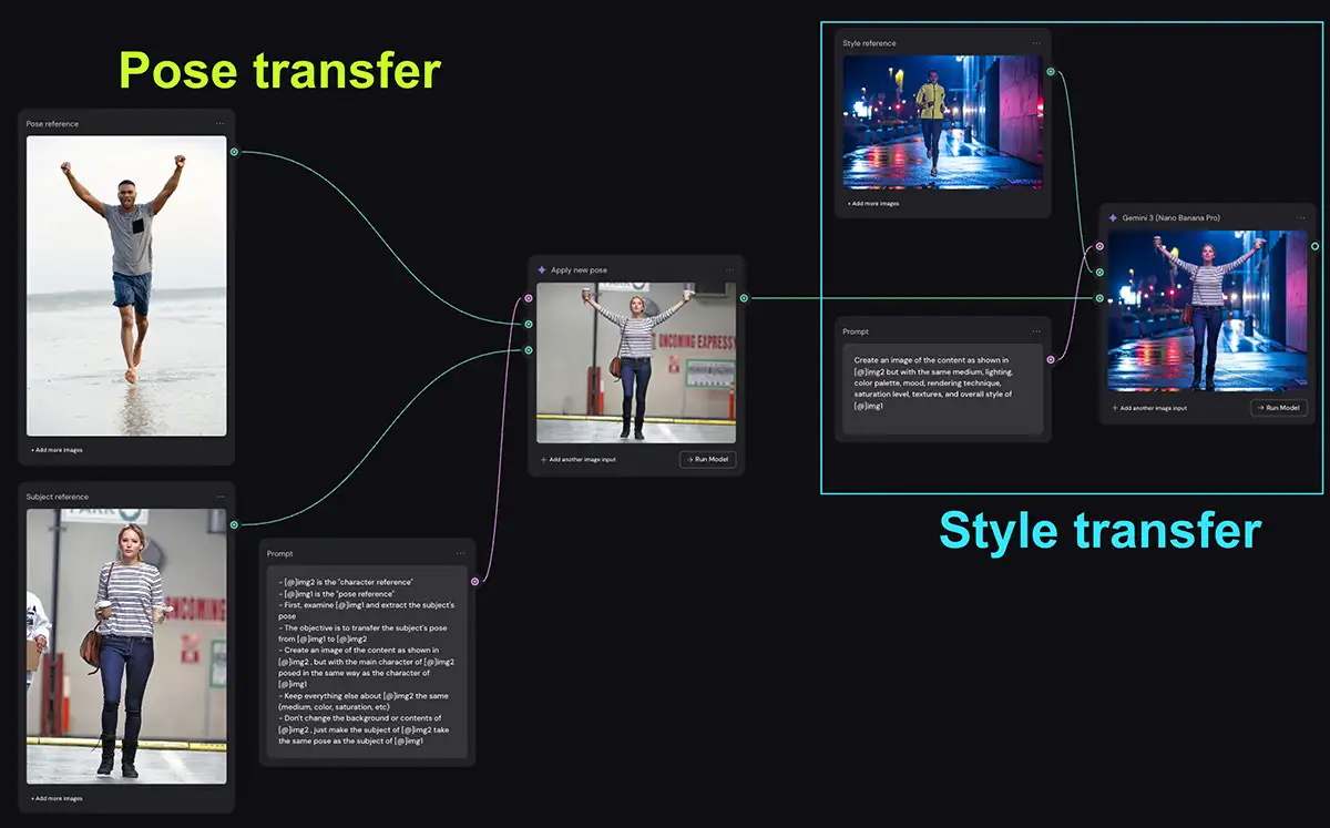We’re now at a point where we can decouple the subject from the structure. With the new Gemini 3 Nano Banana Pro model, specifically using the Weavy node interface, you can take the “soul” of one image and snap it to the “skeleton” of another.