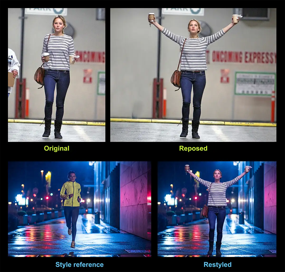The output node (on the right) delivers the result. The model has taken the subject, stripped away her original walking pose, and re-rigged her body to match the celebrating man. It even attempted to adapt the coffee cups she was holding to the new hand positions.