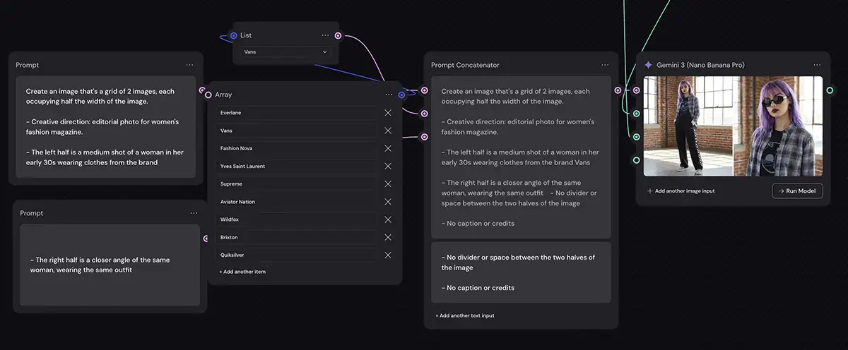 Once we have our product reference, we need to tell the AI how to shoot it. You can just put everything in a single prompt box, but you can make it much more flexible and reusable with a few minutes of setup with Weavy’s list, array and “prompt concatenator” nodes (learn how to use prompt concatenator here in more detail):