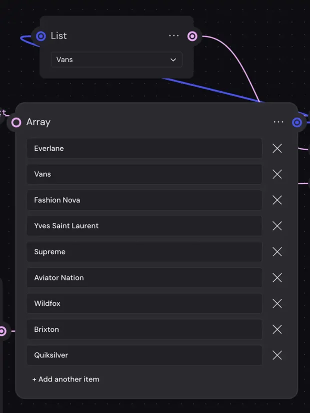 In my Weavy setup, I have a list node (the yellow box) with brands like Supreme, Vans, Everlane, and Yves Saint Laurent.
