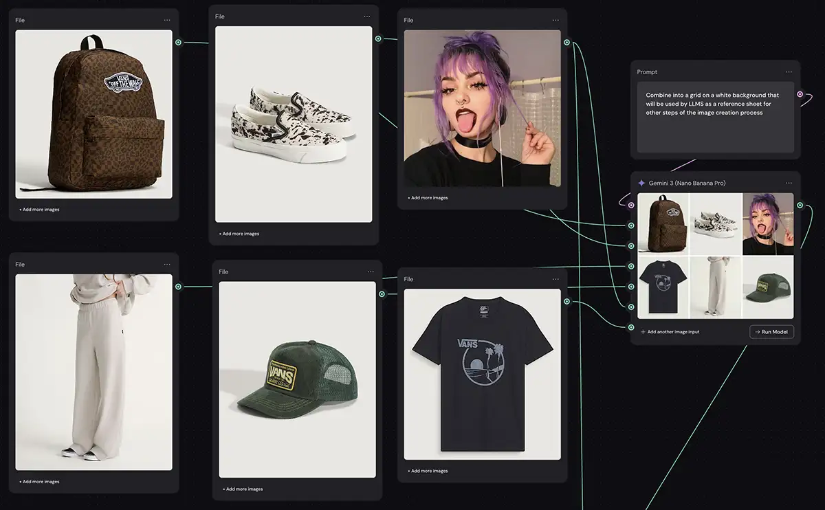 We take our individual assets – the backpack, the slip-ons, the sweatpants, the trucker hat – with the model and we use a simple Gemini 3/Nano Banana node to combine them into a single “collage” image with this prompt: