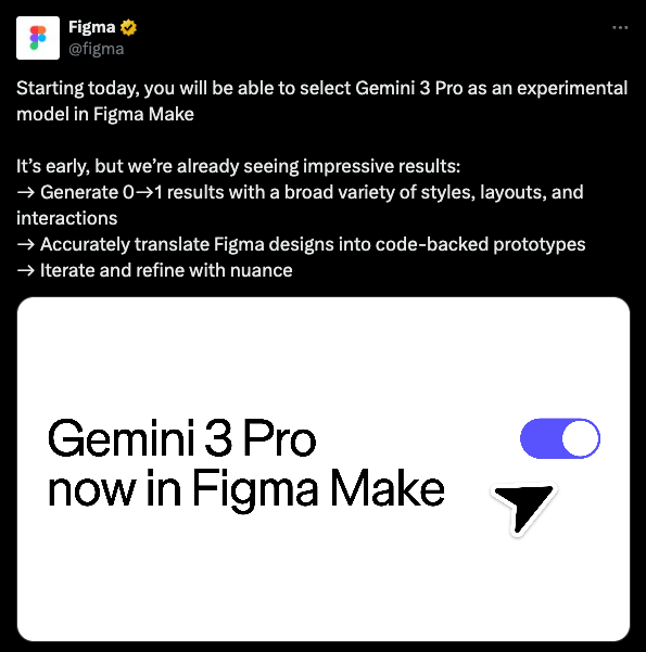 Lots of partnerships on day 1, for example Gemini 3 Pro in Figma Make