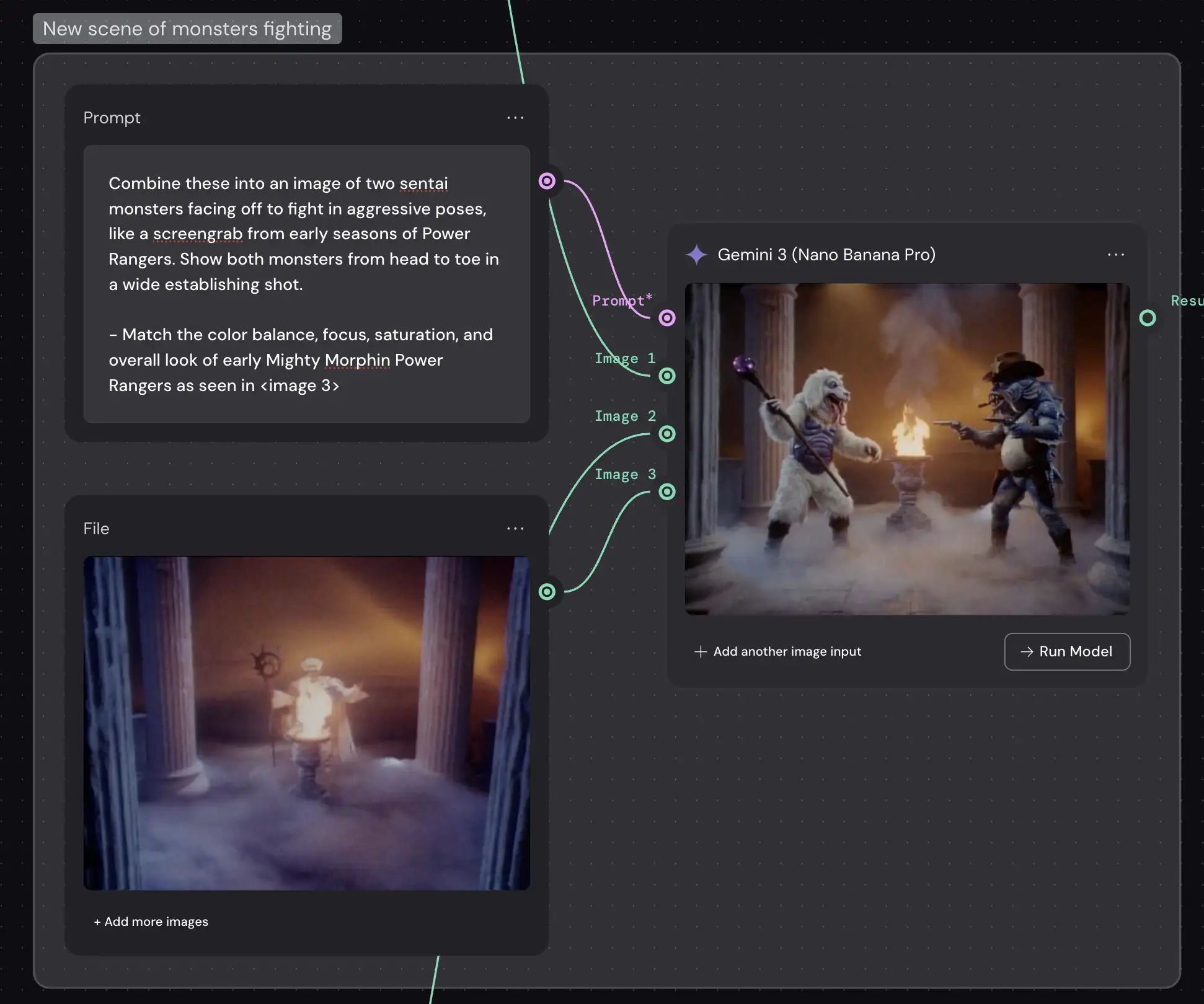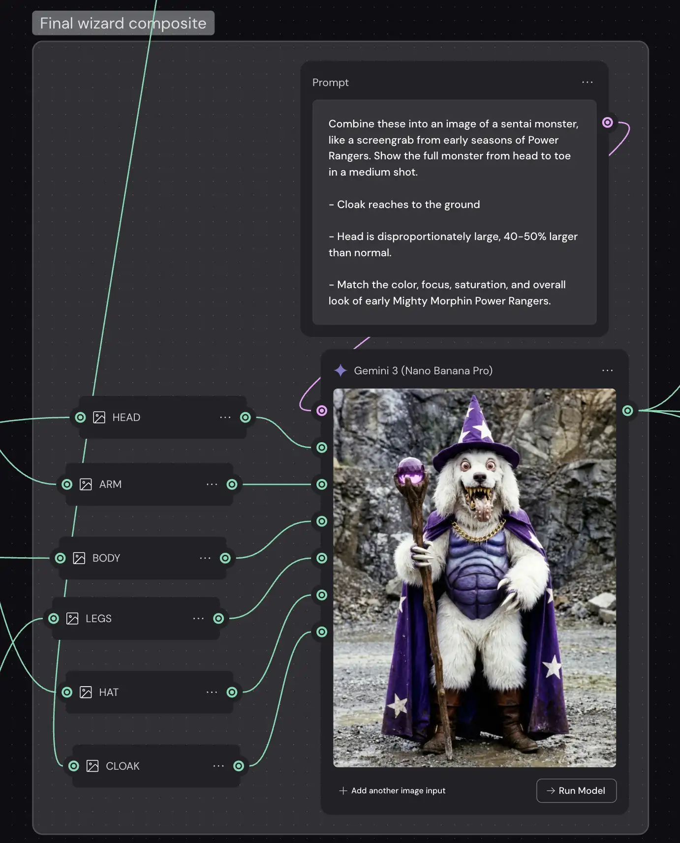 In Weavy, you can wire the outputs of your Head, Body, and Leg nodes directly into a “Combiner” prompt. We tell Nano Banana: “Combine these into an image of a sentai monster… match the color, focus, saturation, and overall look”.