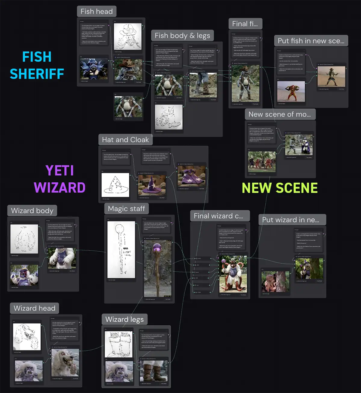 When you try to generate a complex character in one shot – “a fish-sheriff monster fighting a wizard in a desert” – you’ll probably end up disappointed.