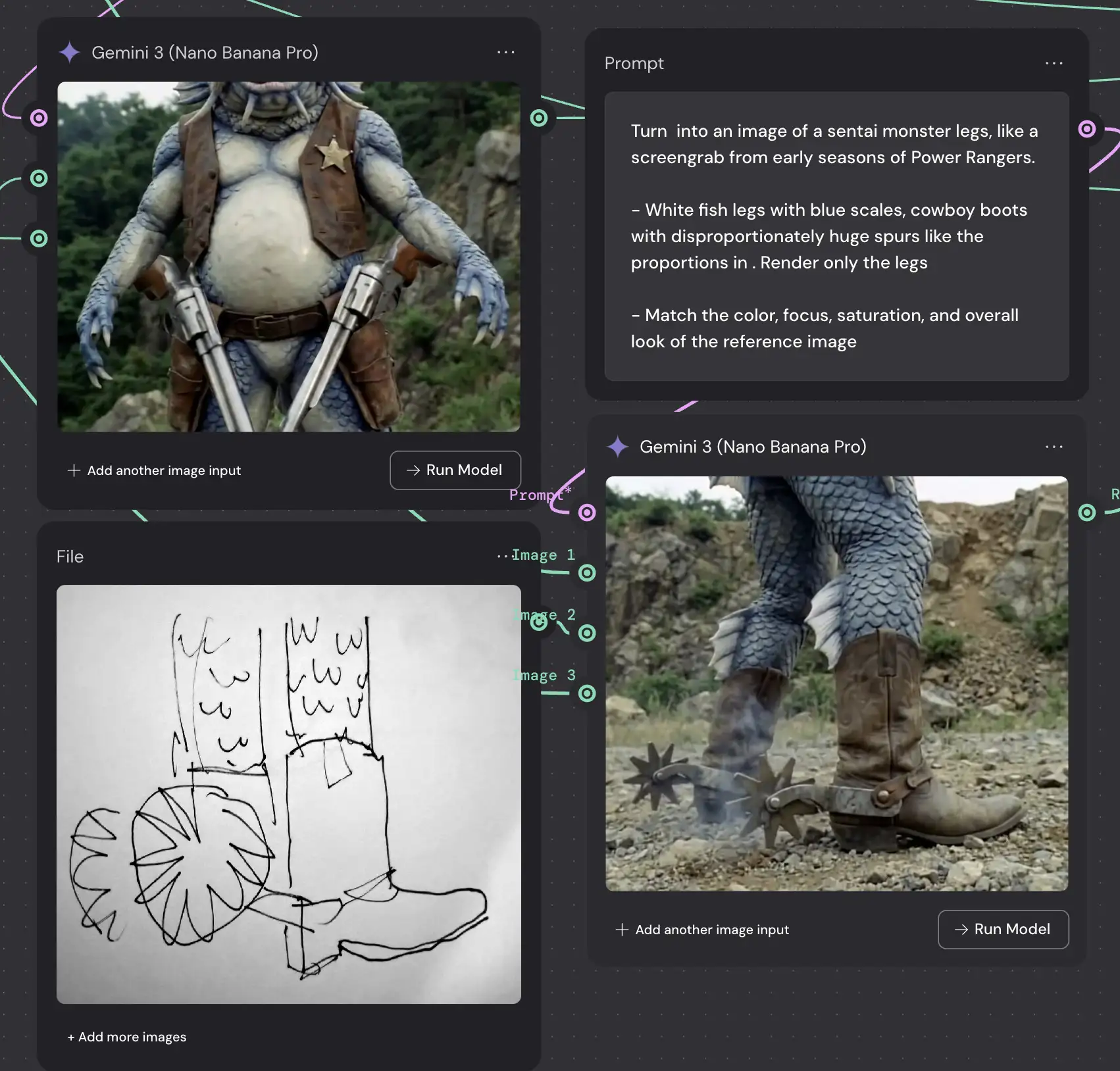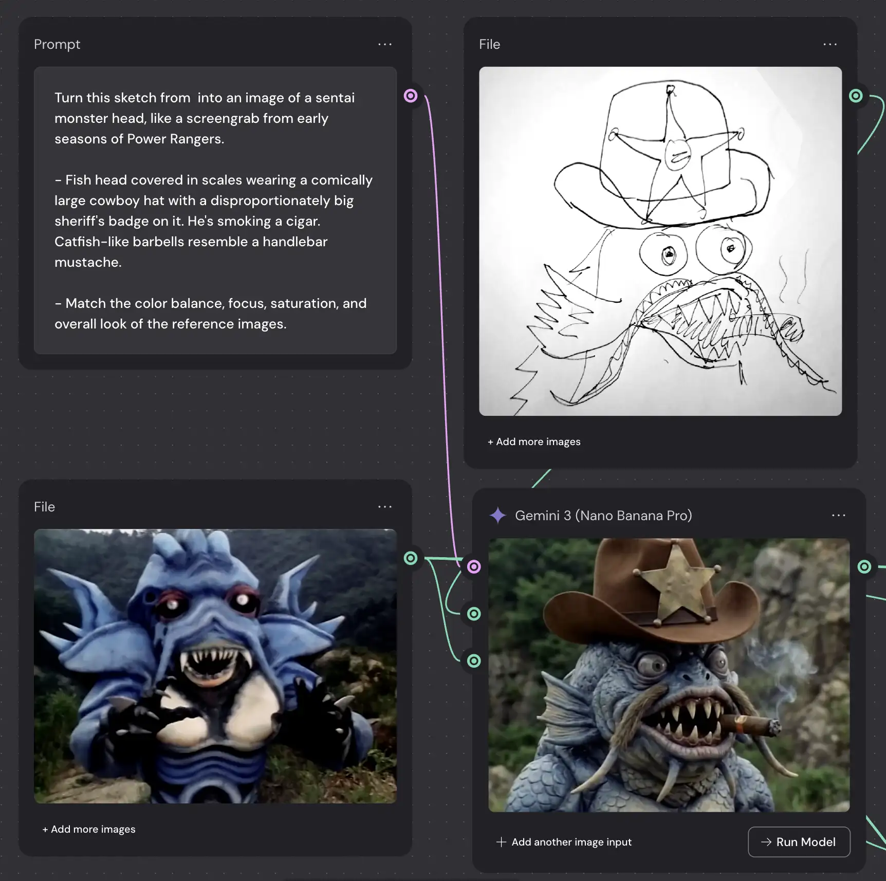 Gemini 3 (Nano Banana Pro)node. The prompt is specific: “Fish head covered in scales wearing a comically large cowboy hat… like a screengrab from early seasons of Power Rangers”. -