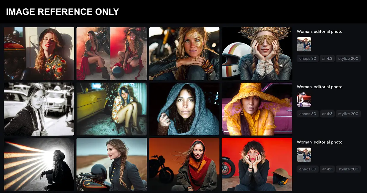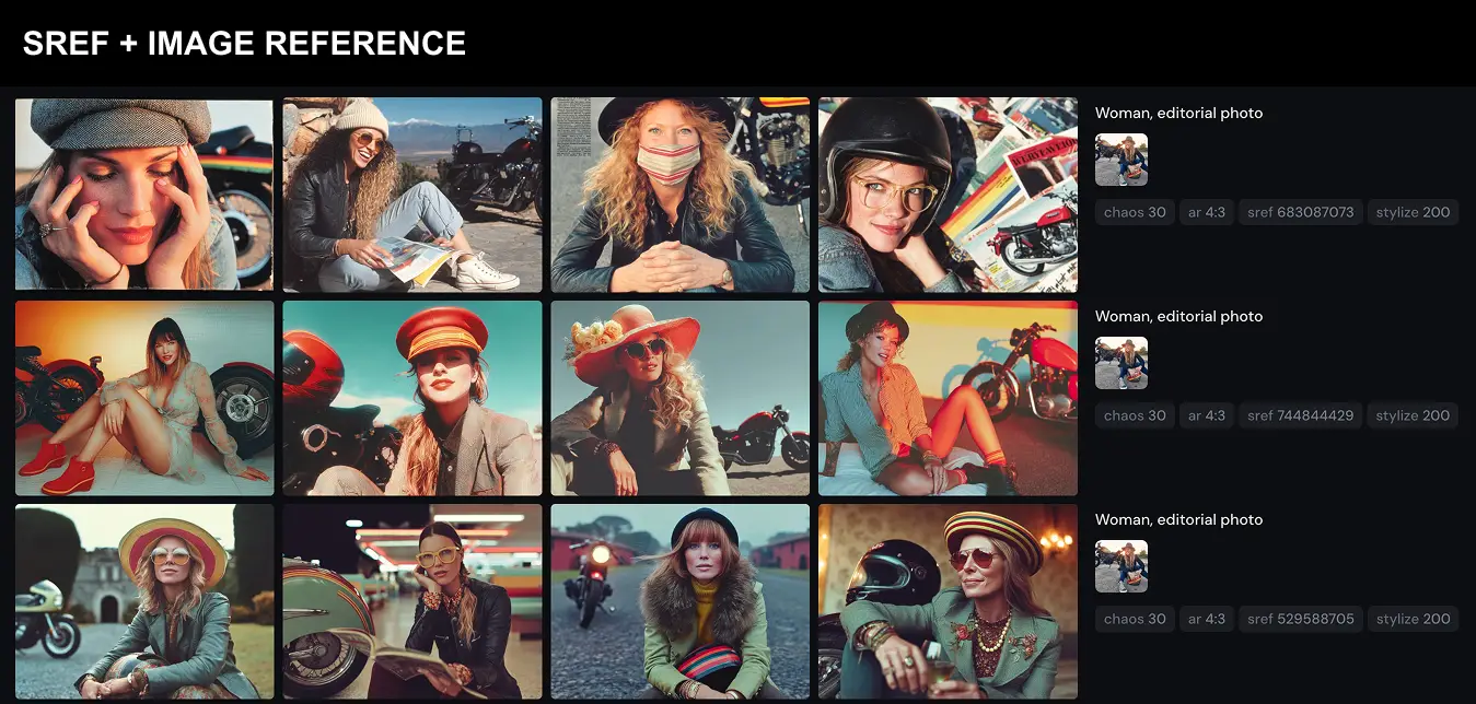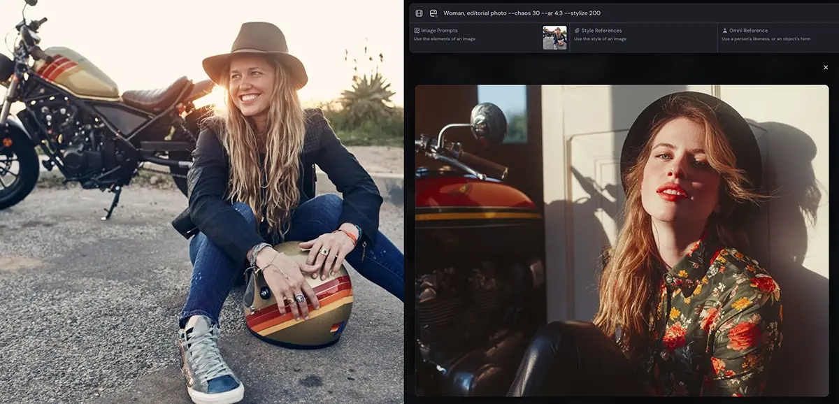 The Test: I took that same generic prompt (“Woman, editorial photo”) but this time I uploaded a reference image of a woman wearing a helmet and goggles.