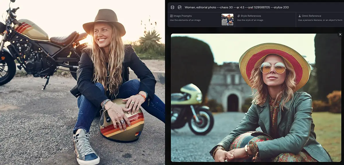 The Result: With the retro code (--sref 529588705), we got the woman in the helmet and goggles (content), but she’s rendered in that specific teal-and-red retro style.