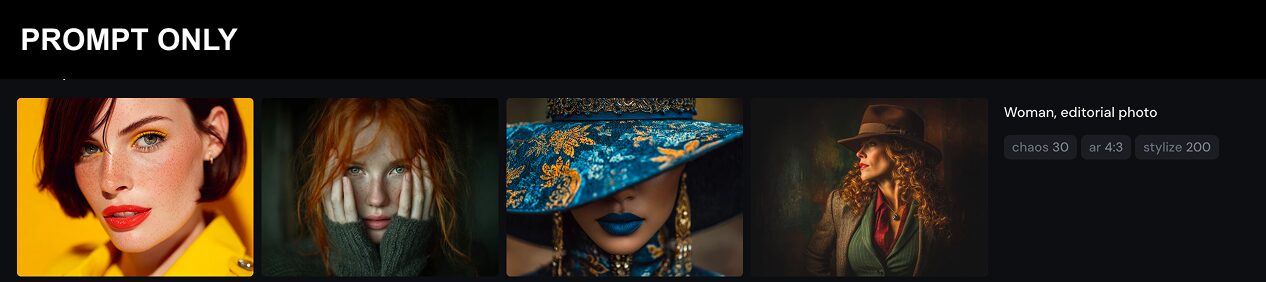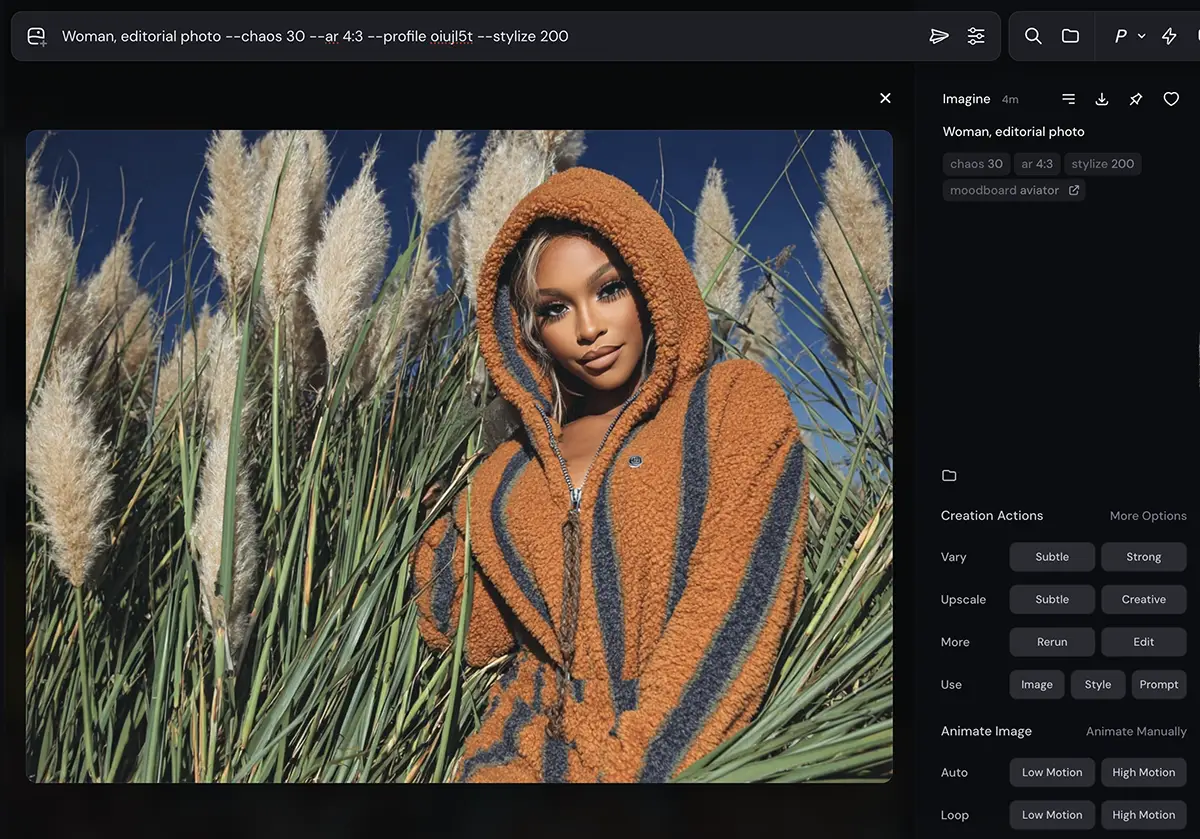 I started with a barebone, open-ended prompt as a baseline: “Woman, editorial photo.” I’m using this as the baseline to let the image/style references do the bulk of the work in terms of aesthetic.