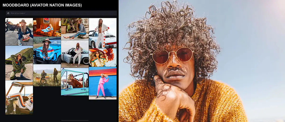 The Test: I built a “Aviator Nation” style moodboard – lots of 70s California surf vibes, rainbows, golden hour lighting, etc. I then applied this moodboard to a prompt.