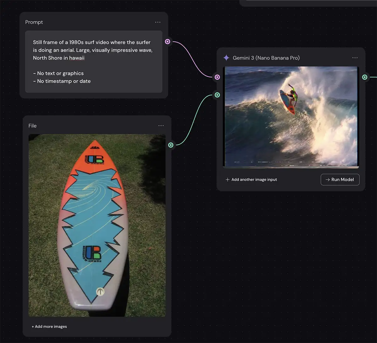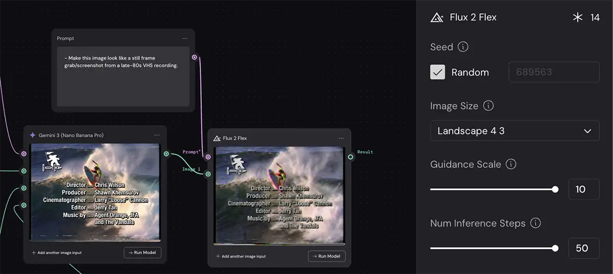 I’m using Nano Banana Pro for the base generation and Flux 2 Flex for the texture, all inside a node-based canvas called Weavy.ai (though you could use Flora, Freepik, or similar tools).