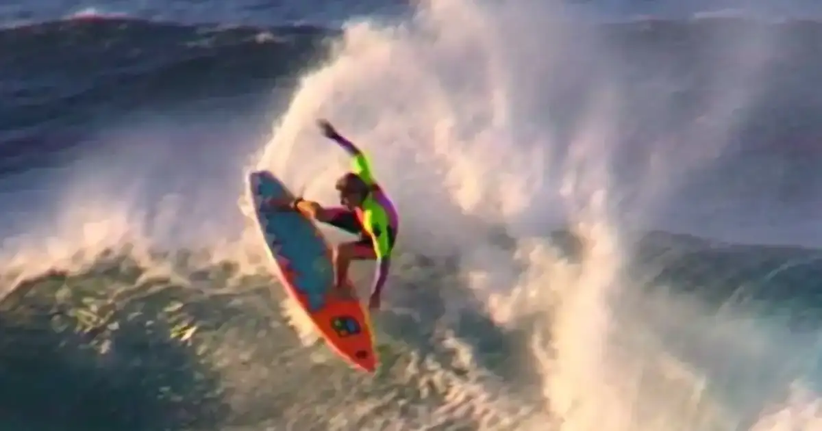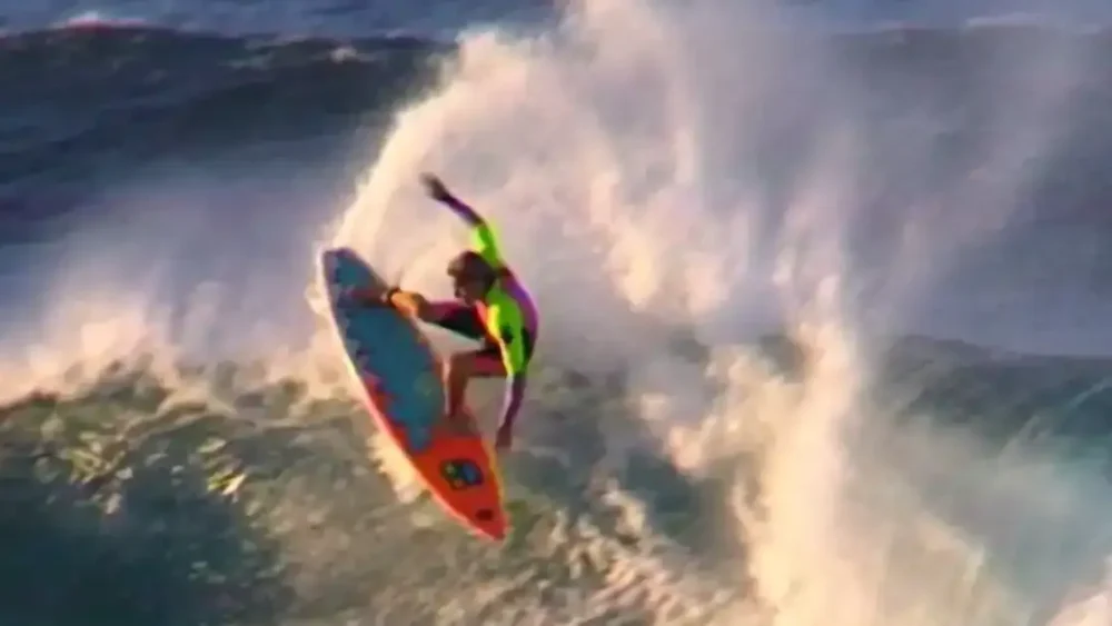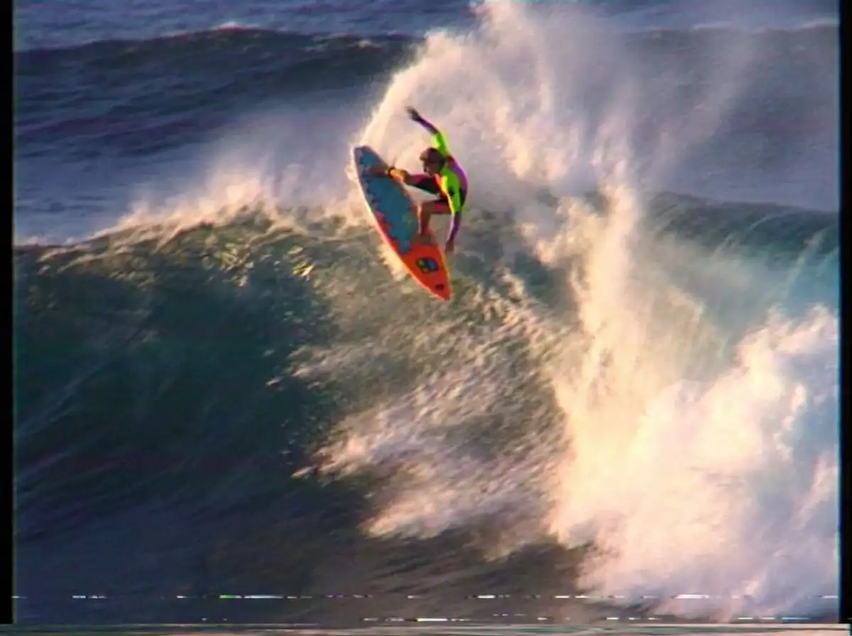 Still frame of a 1980s surf video where the surfer is doing an aerial. Large, visually impressive wave, North Shore in hawaii. – No text or graphics – No timestamp or date