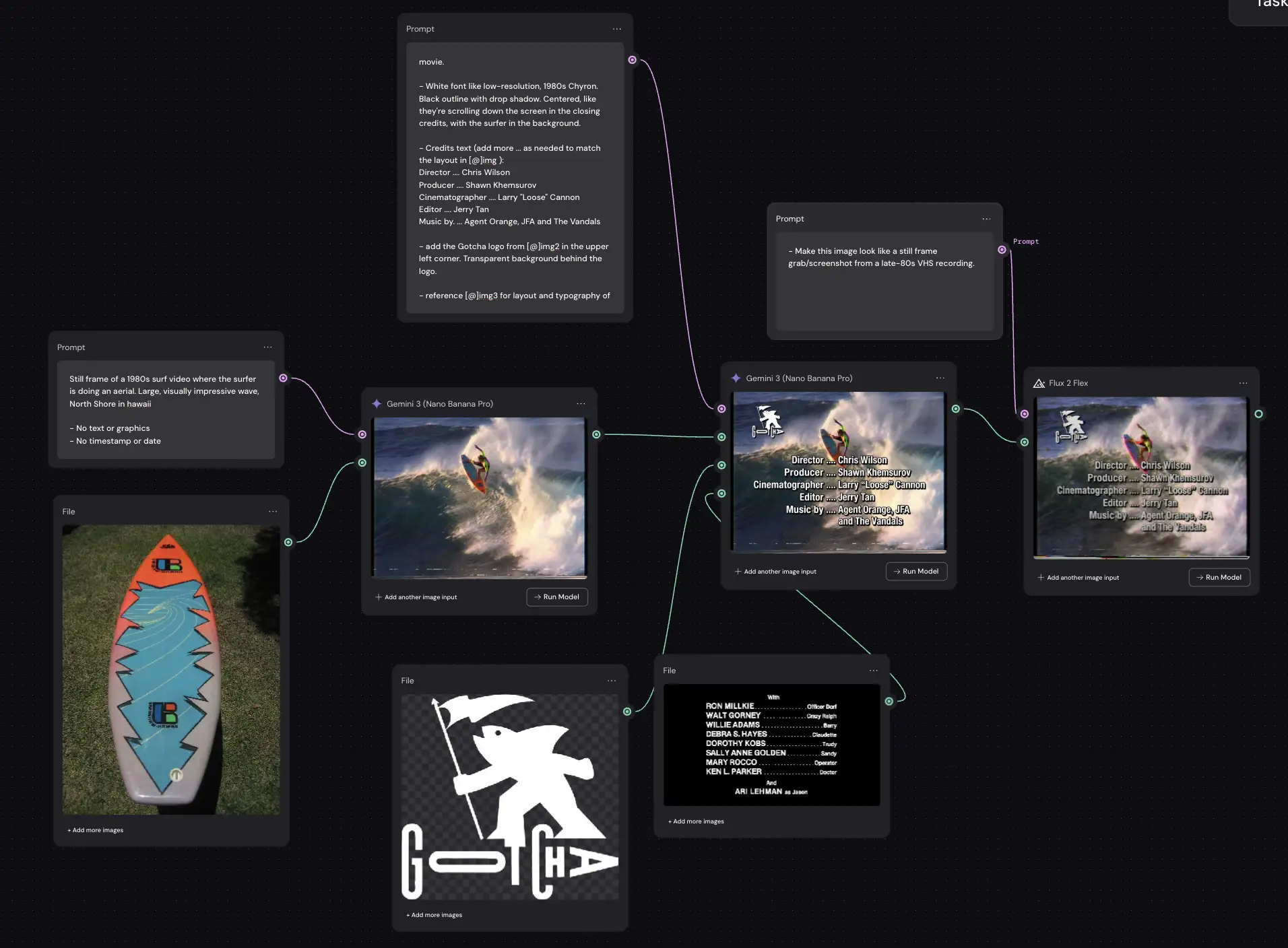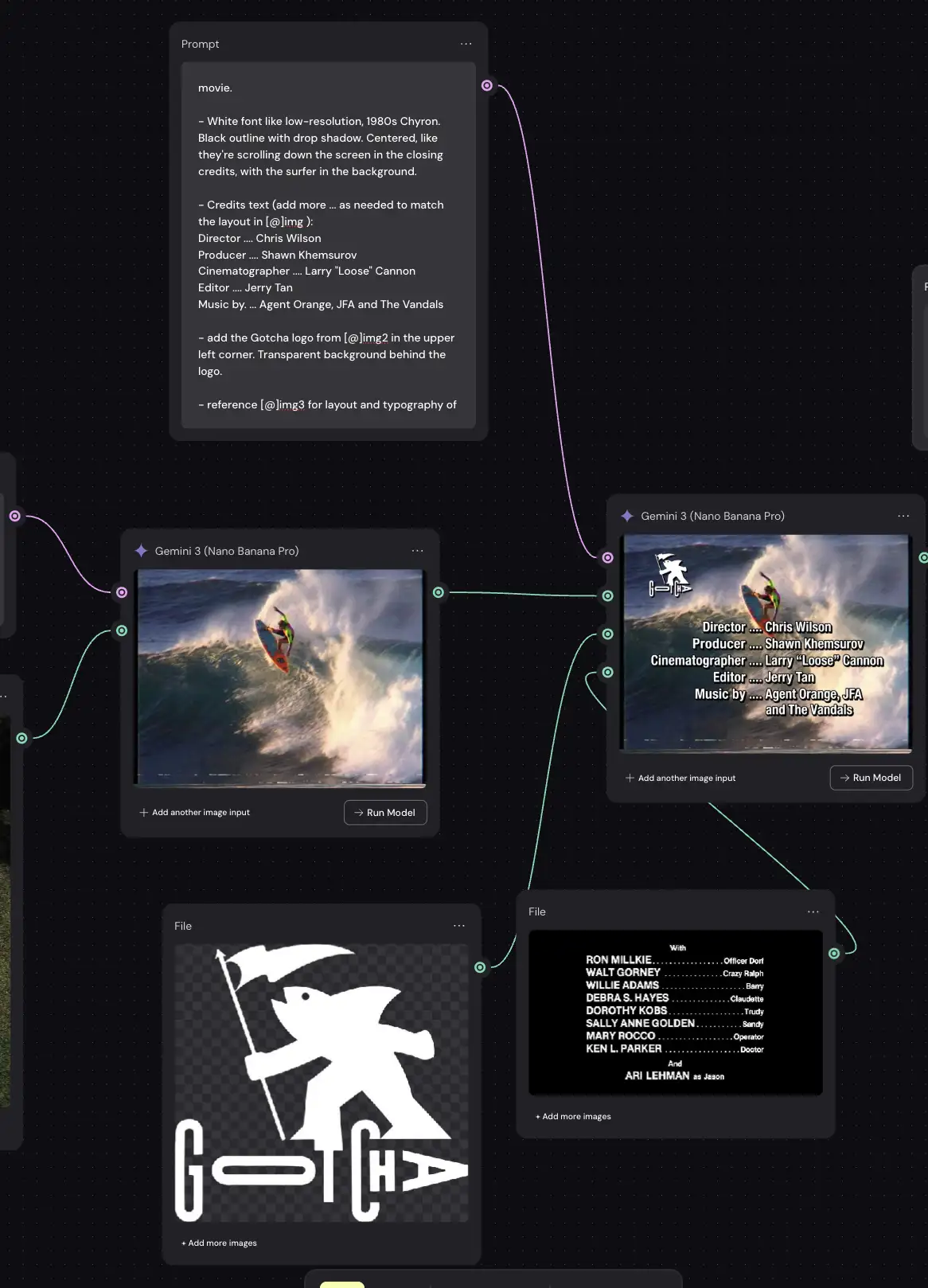 I added the “Gotcha” logo and a block of credits text. By doing this separately, I can tweak the font, the spelling, and the position without changing the surfer image. If I decide I want the director to be “Chris Wilson” instead of “Alan Smithee,” I just change the text node. I don’t have to re-generate the wave.