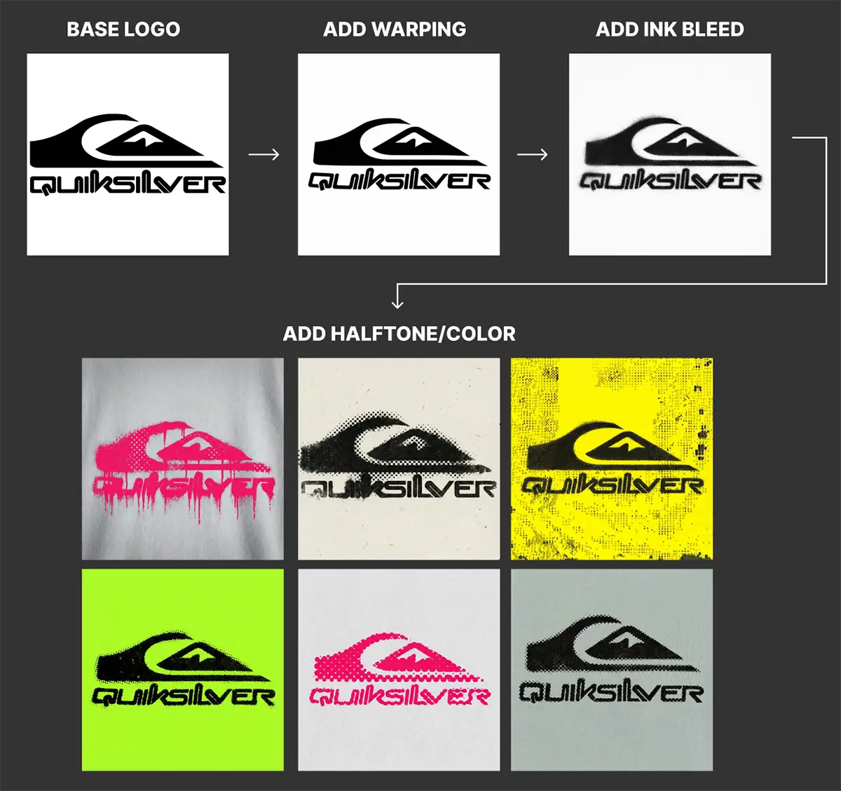- “Add an ink bleed and halftone effect to the logo as shown in [@]img1 in the style of [@]img2 . – Keep the logo, fonts and typography as shown in [@]img1″