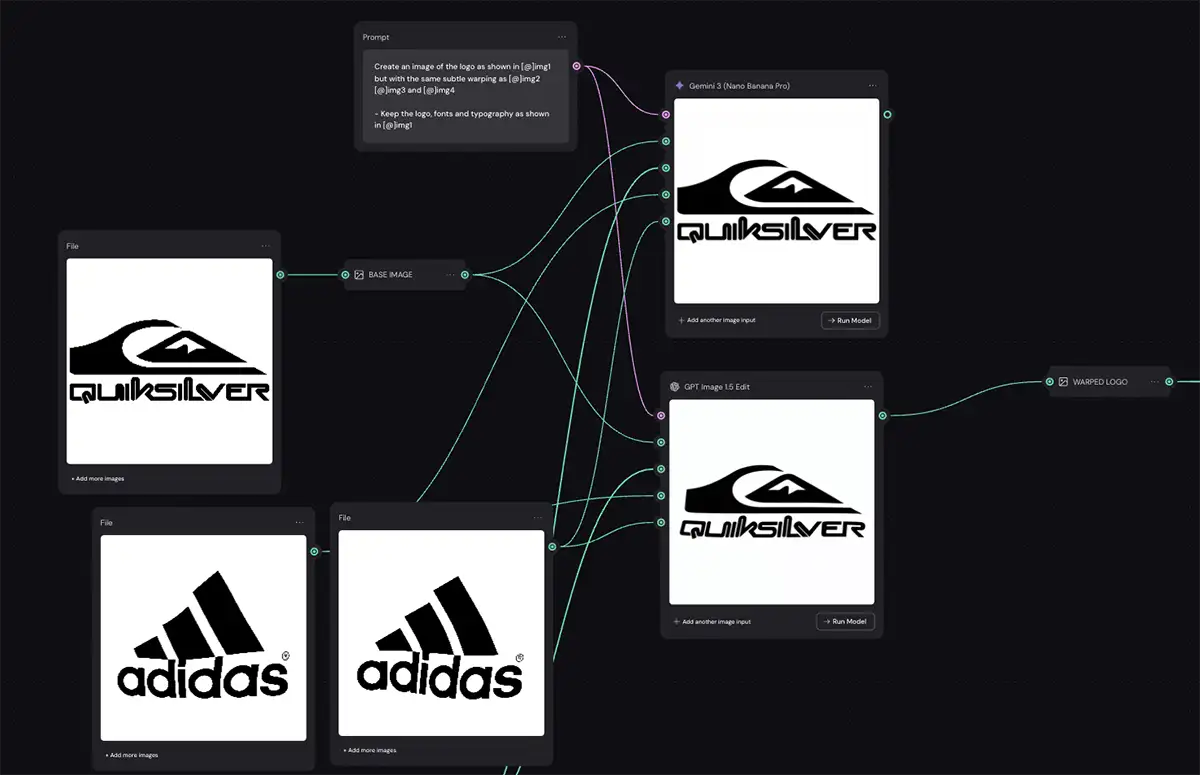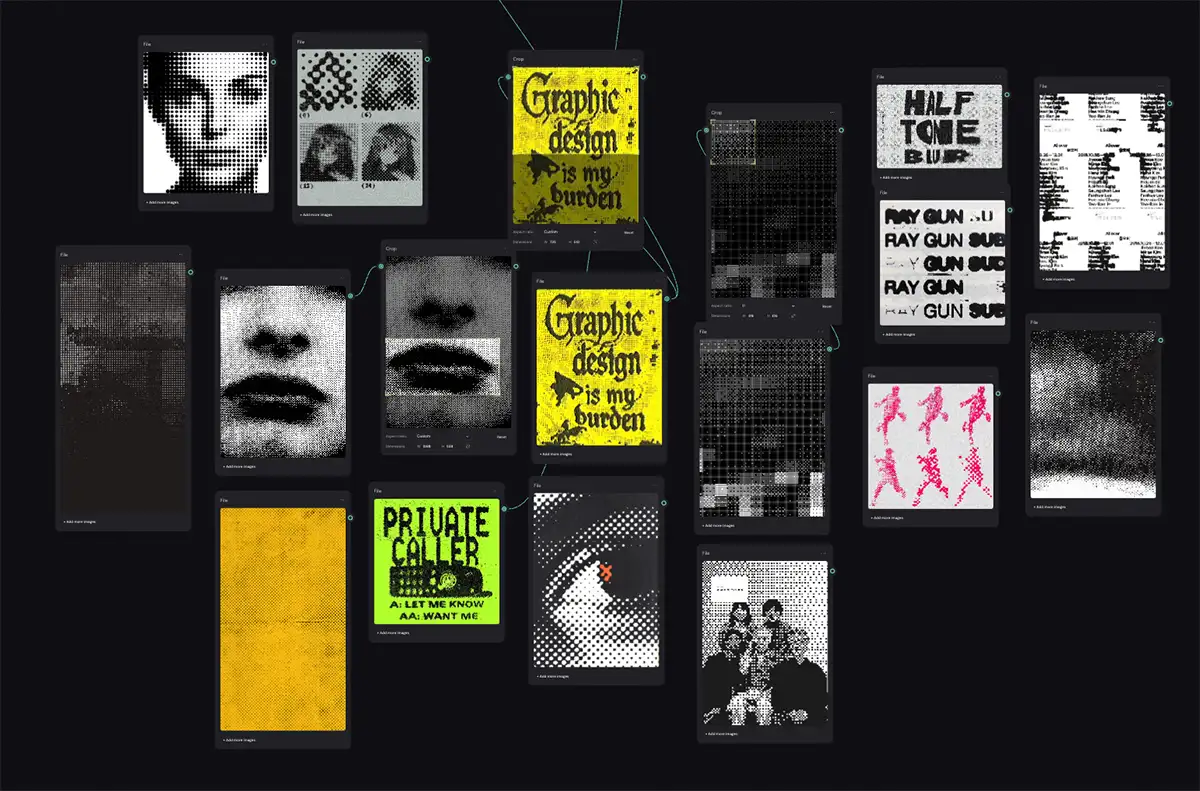 In Weavy, we can build a node-based workflow (Krea AI or Flora work for this too). We can tweak the warp, then tweak the bleed, then tweak the halftone, all independently – full control.