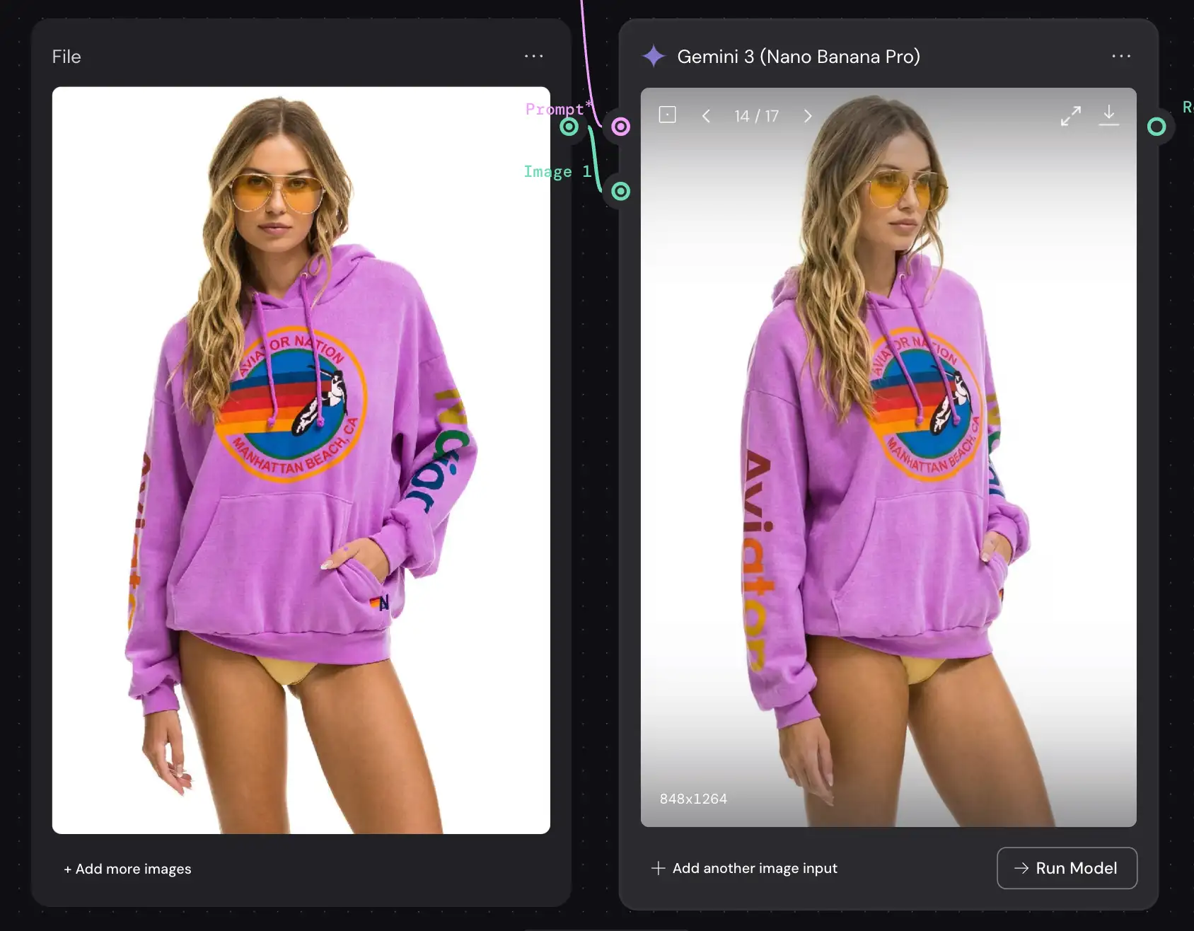 Product Consistency: Here is the killer feature. Nano Banana Pro is a multimodal LLM, not just a diffusion model. It has a world model. It understood that the subject was wearing an Aviator Nation hoodie—likely pulling from its integration with Google Shopping and Google Images—and it rendered the garment with that context in mind.