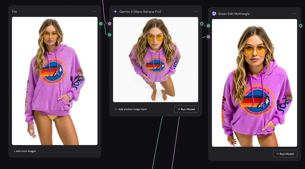 For this test, I used a node-based workflow in Weavy (aka Figma Weave). If you haven’t played with node-based editing yet, it’s like building a visual recipe for your image pipeline. I set up two parallel paths: