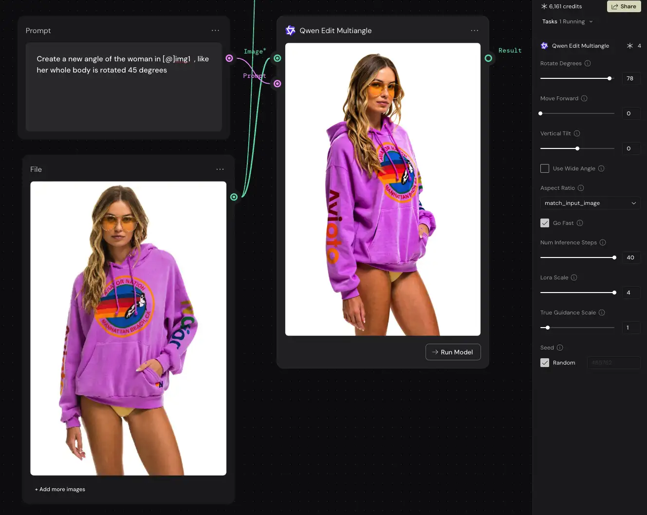 Prompt Adherence: I had to fight the tool a bit here. It didn’t respect the slider parameters for rotation (like “45 degrees”) unless I explicitly wrote them into the text prompt. Now, to be fair, this might be a quirk of Weavy’s implementation, so take it with a grain of salt, but friction is friction.