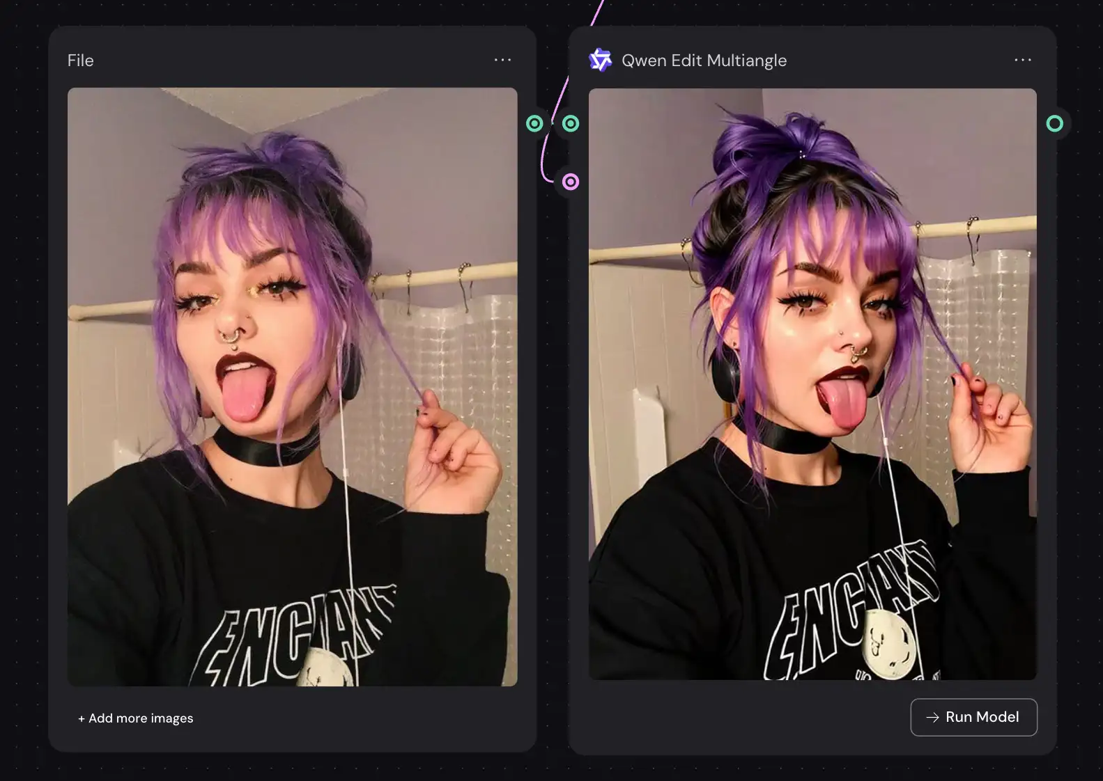 - “Create a new angle of the woman in l@limgl, like her entire body is rotated 45 degrees. Use the same framing as the original image.”