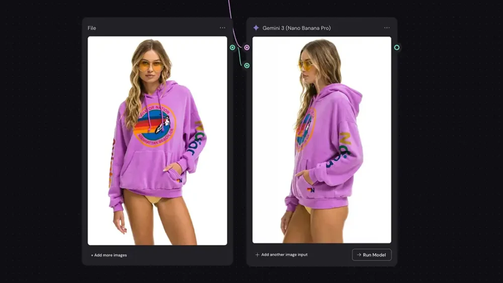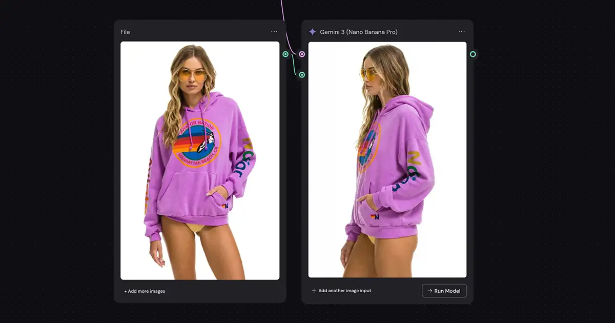 For this test, I used a node-based workflow in Weavy (aka Figma Weave). If you haven’t played with node-based editing yet, it’s like building a visual recipe for your image pipeline. I set up two parallel paths:
