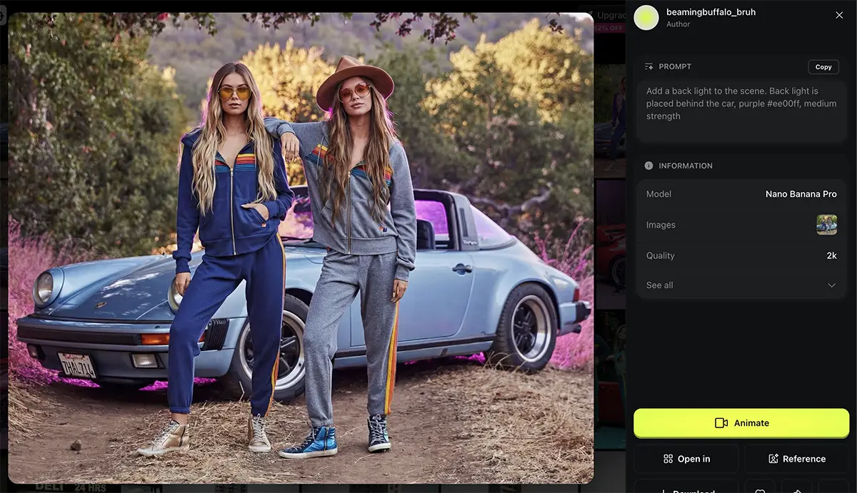 “Add a back light to the scene. Back light is placed behind the car, purple #ee00ff, medium strength”