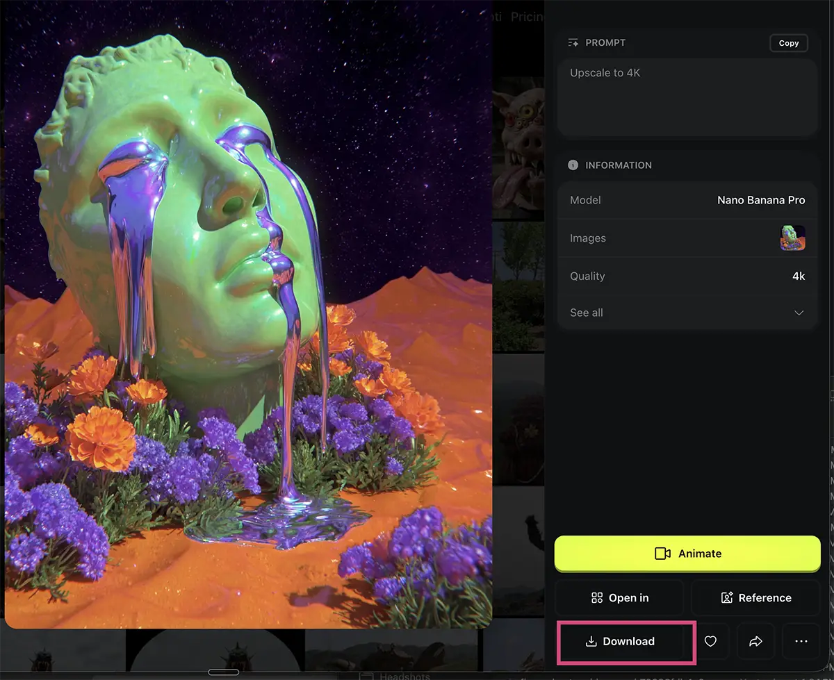Once the generation is done, simply hit download to get your watermark-free, high-res file. Done!