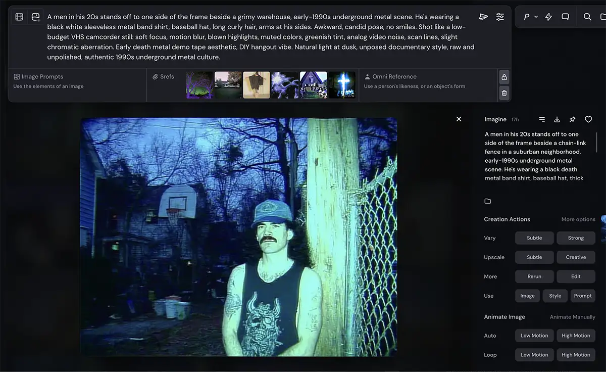 I started in Midjourney because I needed that specific “bad camcorder” look. I didn’t just want a picture of a guy; I wanted the texture of a degraded VHS tape.