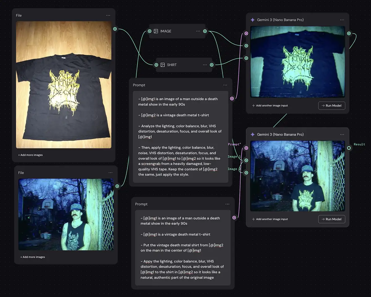 4. The Instructions: I’m telling Nano Banana to “Analyze the lighting, color balance, blur, VHS distortion… of [Input 1]” and then “apply that style to the shirt in [Input 2] so it looks like a screengrab from a heavily damaged VHS tape.”