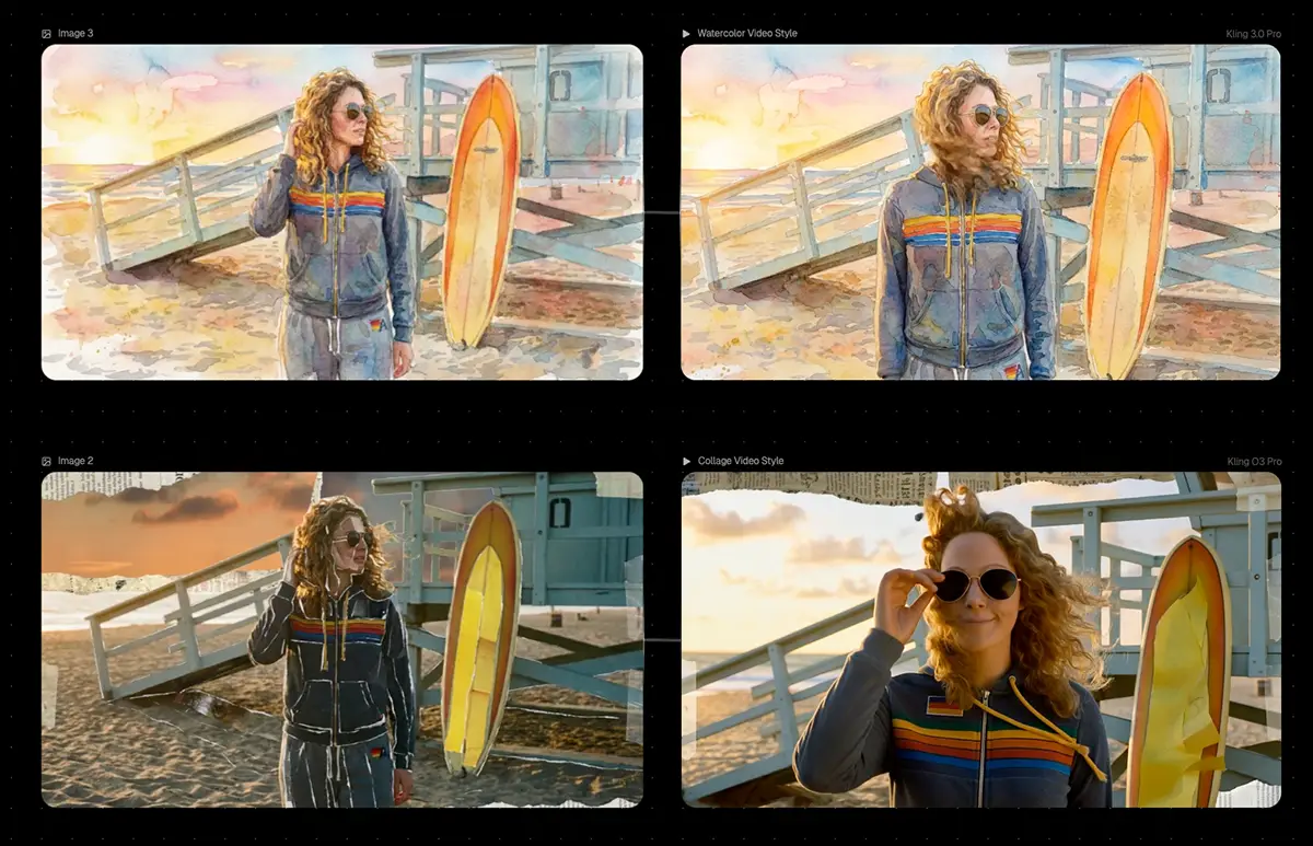 The Workflow: I started by generating a standard realistic video using the Start/End frames feature in Kling 3 Pro. Then, I tried to push it in two different artistic directions: Watercolor and Collage.