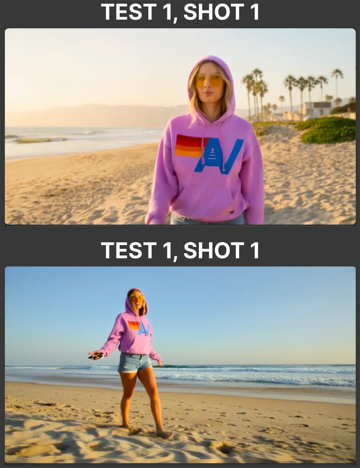 The Goal: Create a consistent character (a woman in an Aviator Nation hoodie) across multiple distinct shots.