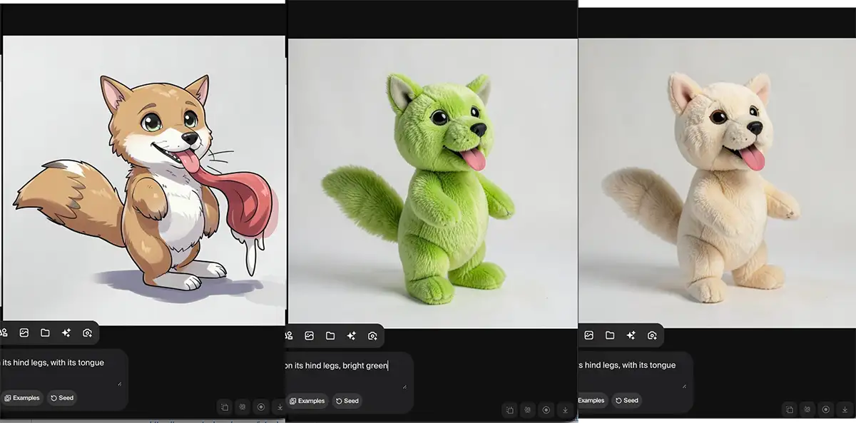 You can change the prompt text while the image is active. I took that same underlying dog sketch and swapped the prompt from a “plush doll” to a “claymation model,” an “anime drawing,” and even a “vinyl toy.” It updated the look in about 0.5 seconds. You can literally see the material and lighting shift as you type.