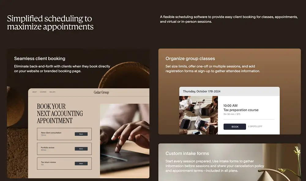 • Scheduling: A full-featured appointment booking system (Acuity Scheduling) that integrates directly into your site.