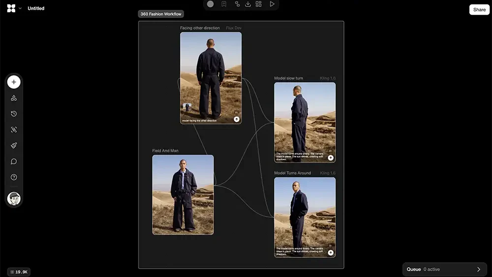 Staring at a blank node canvas can be intimidating. Flora solves this with “Flows”—essentially, workflow templates for specific industries. A fashion designer can load a “Garment Try-On Flow” that already has the necessary nodes for human inputs, masking, and diffusion. An architect can use a “Sketch to Render” flow to turn a rough drawing into a photorealistic visualization. This structure drastically lowers the barrier to entry for complex workflows and delivers immediate value.