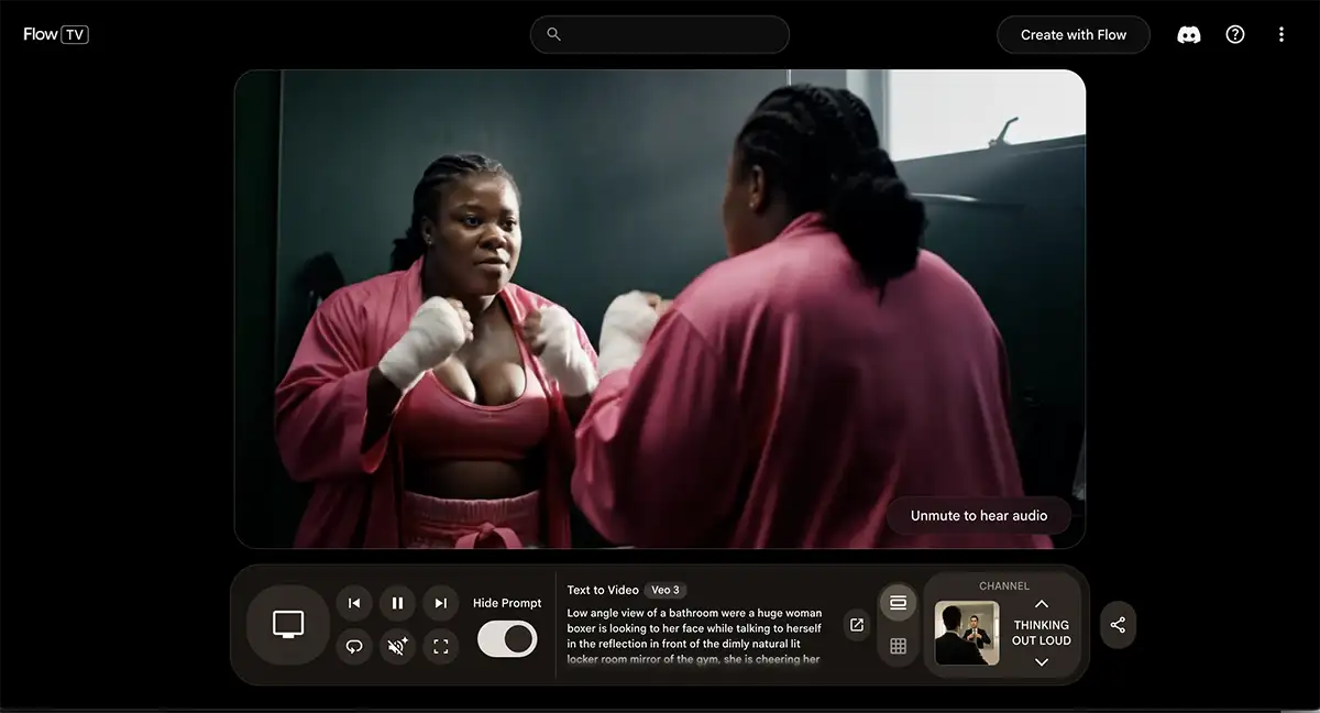 Flow includes a section called Flow TV, which is a gallery of videos to show you how to use the app. You can watch clips created by other pros—like a cinematic shot of a boxer psyching herself up in a locker room, and see the exact prompt they used. You can see the model (e.g., Veo 3), the settings, and the syntax. Very helpful to get an idea of the nuances in action, since video prompting is still a new thing for most of us.