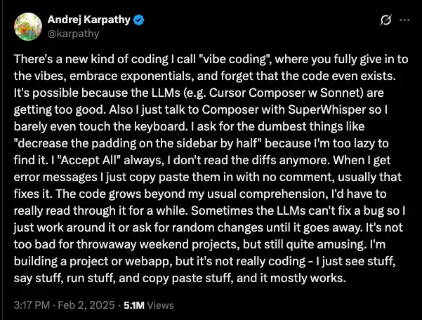 You’ve probably seen people talk about “vibe coding.” It was original coined by Andrej Karpathy as a tongue-in-cheek term, but it’s caught on as a way to refer to the new style of software development where you let AI take the wheel.